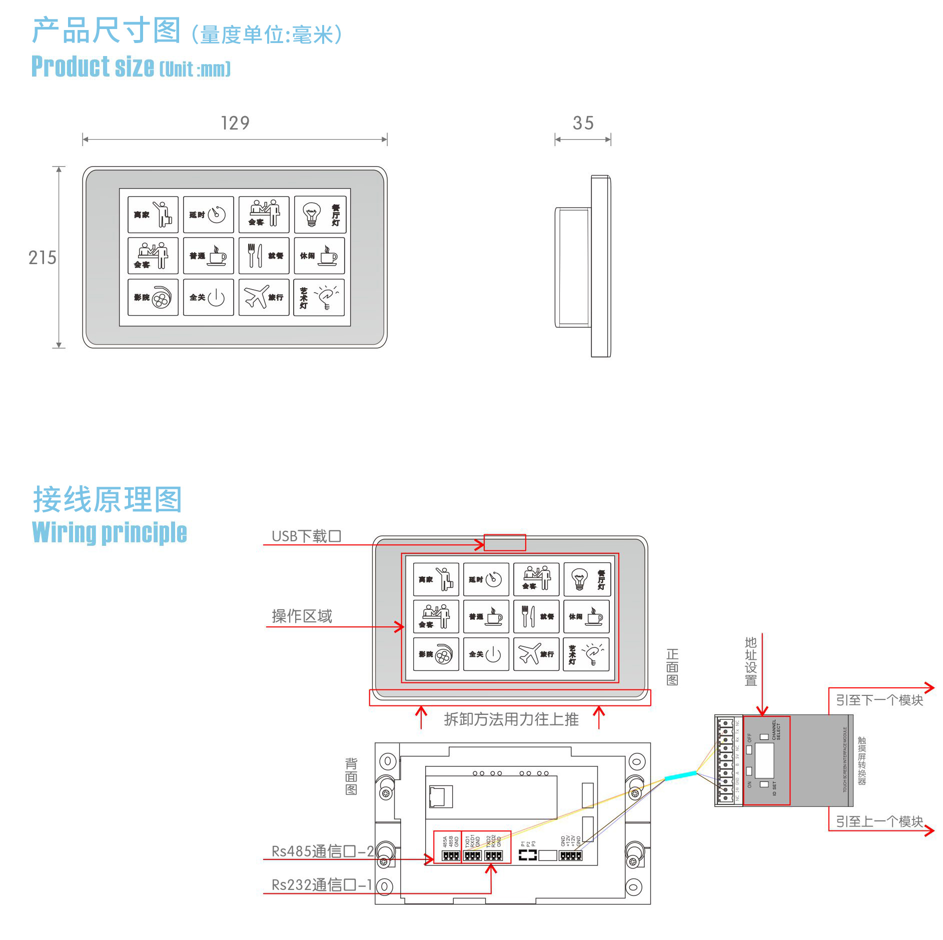 7寸65K真彩屏單控開關(guān)、窗簾和場景總線控制,可自定義界面支持3D文字、3D圖片,個性化界面;用于集中控制放在客廳或床頭,支持雙向通信; |