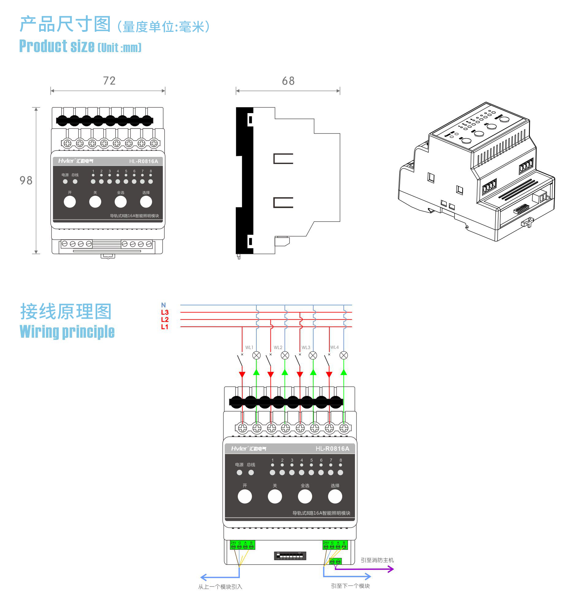 | 1,標(biāo)準(zhǔn)導(dǎo)軌式安裝占4個(gè)模數(shù)位; 2,提供4路16A繼電器開關(guān),每回路可獨(dú)立控制3300W設(shè)備開關(guān); 3,可設(shè)置各回路的開機(jī)初始值; 4,具備多回路順序延時(shí)啟動(dòng)功能,避免同時(shí)啟動(dòng)造成對(duì)電網(wǎng)的沖擊; 5,執(zhí)行場景命令后立即向監(jiān)控中心返回各個(gè)回路的實(shí)際開關(guān)狀態(tài); 6,具有本機(jī)及遠(yuǎn)程編程、測試功能; 7,自帶應(yīng)急開關(guān)按鍵,方便調(diào)試; 8,自帶回路狀態(tài)指示燈,開關(guān)狀態(tài)一目了然; 9,支持在線刷新程序; 10,采用HVLER-Net總線通信 | 1,供電電壓: DC24V,90mA ; 2,受控回路:4路繼電器開關(guān); 3,繼電器回路開關(guān)負(fù)載 (阻性):AC 250V / 抗浪涌能力達(dá)到170A以上; 4,繼電器最大切換電流:16A; 5,繼電器機(jī)械耐久性:10,000,000次; 6,繼電器電耐久性:100,000次; 7,靜功率消耗:0.5W ; 9,最大功耗:8W; 10,控制端口:2×HVLER-Net; 11.網(wǎng)絡(luò)連接設(shè)備最大數(shù)量:64個(gè); 12,外觀尺寸:72mm(L)×98mm(W)×68mm(H); 13,重量:264g/p | 本產(chǎn)品4路16A智能照明模塊為導(dǎo)軌式安裝,含4路智能繼電器,每回路可獨(dú)立控制3300W燈具的開關(guān),帶應(yīng)急按鍵,LED燈時(shí)時(shí)指示各個(gè)回路開關(guān)狀態(tài)。 |